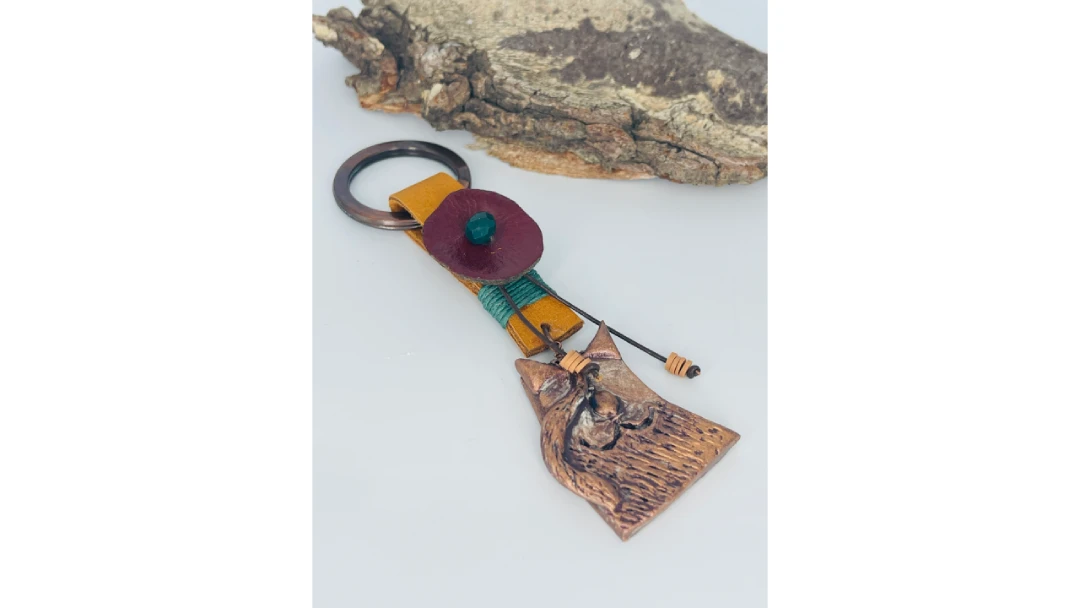Χειροποίητο μπρελόκ με πήλινο γατάκι και δέρμα